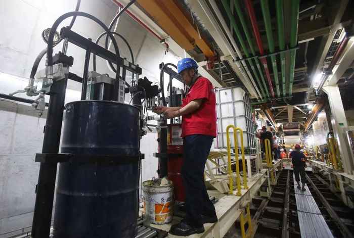 今天(7月3日)上午,在北京地铁19号线积水潭站的明挖防尘隔离棚内,“八局二十号”盾构机如期始发。摄影/新京报记者 王贵彬