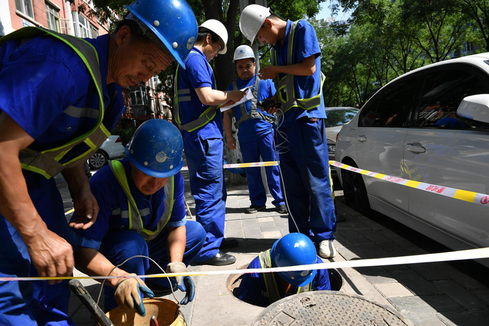 槐柏树街南里附近,工作人员正对一处漏水设施进行抢修。摄影/新京报记者 吴江