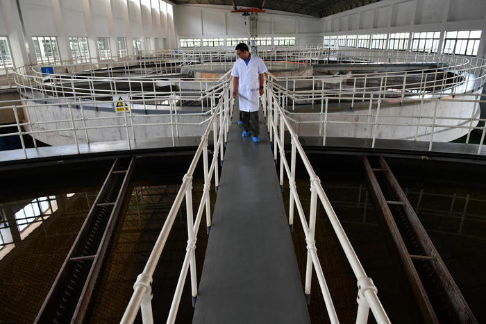 郭公庄水厂工作人员正在机械加速澄清池车间检查水质。摄影/新京报记者 吴江