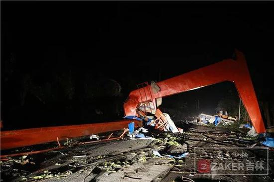 记者在现场看到一个龙门吊,不知是从哪里倒下来的,这个龙门吊的右侧有一家工厂,吹倒的龙门吊疑似来自该处。
