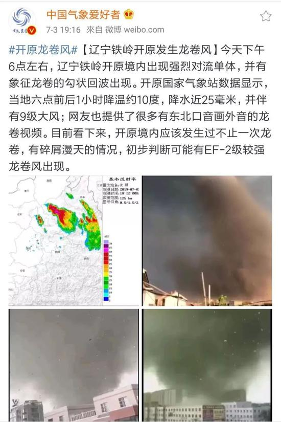 7月3日下午5点15分左右,辽宁省开原市遭受突发龙卷风袭击,附近风速达23米 / 秒(9级)。龙卷风由金沟子镇形成,经兴开街道,开原经济开发区,向南持续15分钟后,减弱成低压。