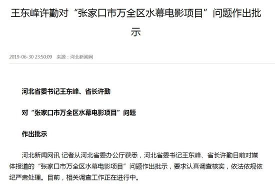 6月30日,河北新闻网发布消息,省委书记王东峰、省长许勤日前对媒体报道的“张家口市万全区水幕电影项目”问题作出批示,要求认真调查核实,依法依规依纪严肃处理。