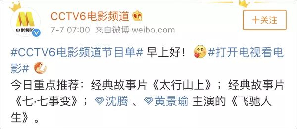 上午7时,@CCTV6电影频道 准时发布当天节目预告,并重点推荐了18时03分放映的《太行山上》和20时15分放映的《七·七事变》等影片。