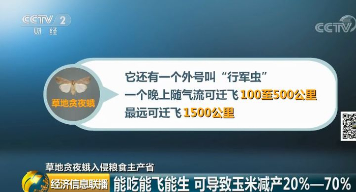 植保专家说,草地贪夜蛾可以导致玉米减产20%-70%,甚至绝收。而它还有一个外号叫“行军虫”,一个晚上随气流可迁飞100至500公里,最远可迁飞1500公里,还能在气温11℃至30℃的环境下生存和繁殖。