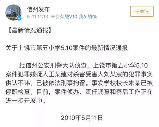 经信州公安刑警大队侦查,上饶市第五小学5.10案件犯罪嫌疑人王某建对杀害受害人刘某宸的犯罪事实供认不讳,已被依法刑事拘留。事发学校校长朱某已被停职检查。目前,案件侦办、责任调查和善后工作正在进一步开展中。