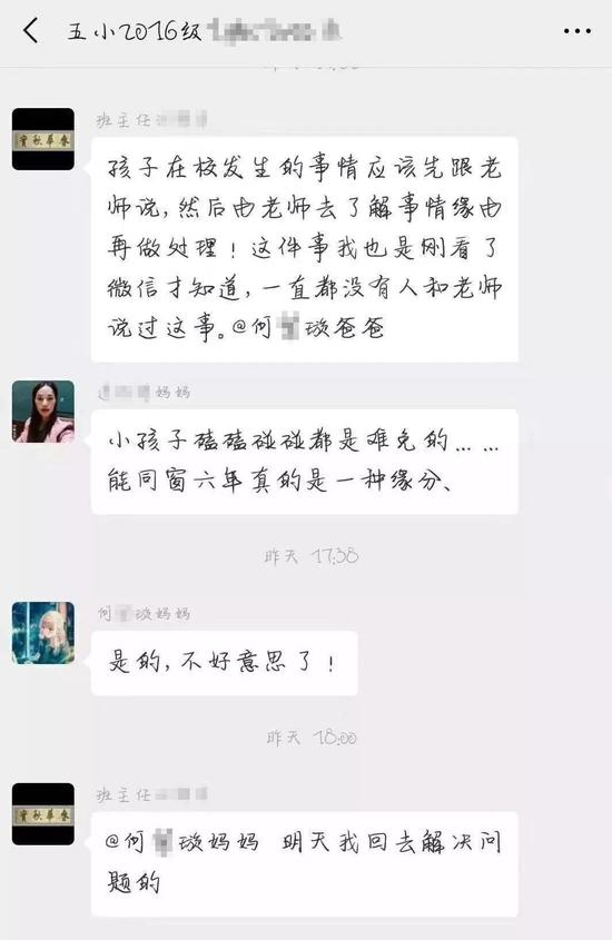 还有一张聊天截图显示,群内昵称为班主任汪某华的群成员称:“孩子在校发生的事情应该先跟老师说,然后由老师去了解事情缘由再做处理。这件事我也是刚看了微信才知道,一直都没有人和老师说过这件事。”
