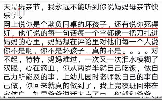 5月12日,遇害男孩妈妈发文悼念。文中写道,亲爱的宝贝,你在天堂好吗?我永远不能听到你说妈妈母亲节快乐了……网上说你是个欺负同桌的坏孩子,还有说你死得好……妈妈想在评论里对他们每一个人说你不是啊,你不是坏孩子,真的不是……妈妈是医生,救了好多人,却没有来得及救你。