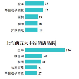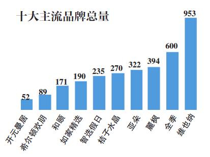 十大主流中端酒店总量中,维也纳(含维也纳国际、维也纳皇家、维纳斯国际)总量最多,在营数量为953家(去年905家),其次为全季,在营总数为600家(去年551 家),第三名为麗枫,在营总数为395 家(去年412家)。第四名是亚朵(含亚朵轻居),在营总数为322 家,智选假日(含假日),在营总数为235家(去年211家),如家精选在营总数为190家(去年177家),和颐在营总数为171家(去年152家),希尔顿欢朋在营总数为89家(去年63家),开元曼居在营总数为52家(去年42家)。