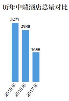 2017 年,中端酒店总量为1655 家,2018年中端酒店总量为2980 家,截至2019 年上半年,中国中端酒店总量为3277家。