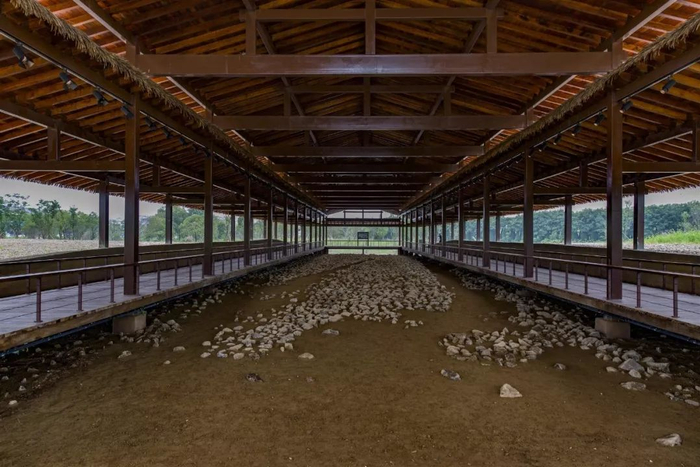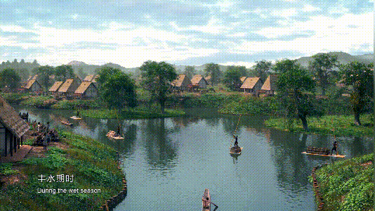 南城墙的下一站即是公园的河道与作坊区,这里可以看到流淌了5000年的钟家港河道,它是贯通良渚古城南北的主干道。公园还在河道两侧还原了当时紧贴河岸的竹编和成排的护岸木桩,平台上的雕塑则展现了良渚先民夹河而居的生活情景。