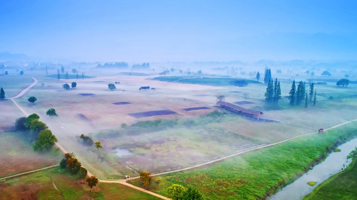 陆城门遗址是游览车的第一个停靠点。一进入公园,最先映入眼前的是一大片的水稻,稻田里白鹭成群嬉戏。这里是良渚古城唯一的一个陆路城门,除此之外,进出内城都要靠河道,划船进出。