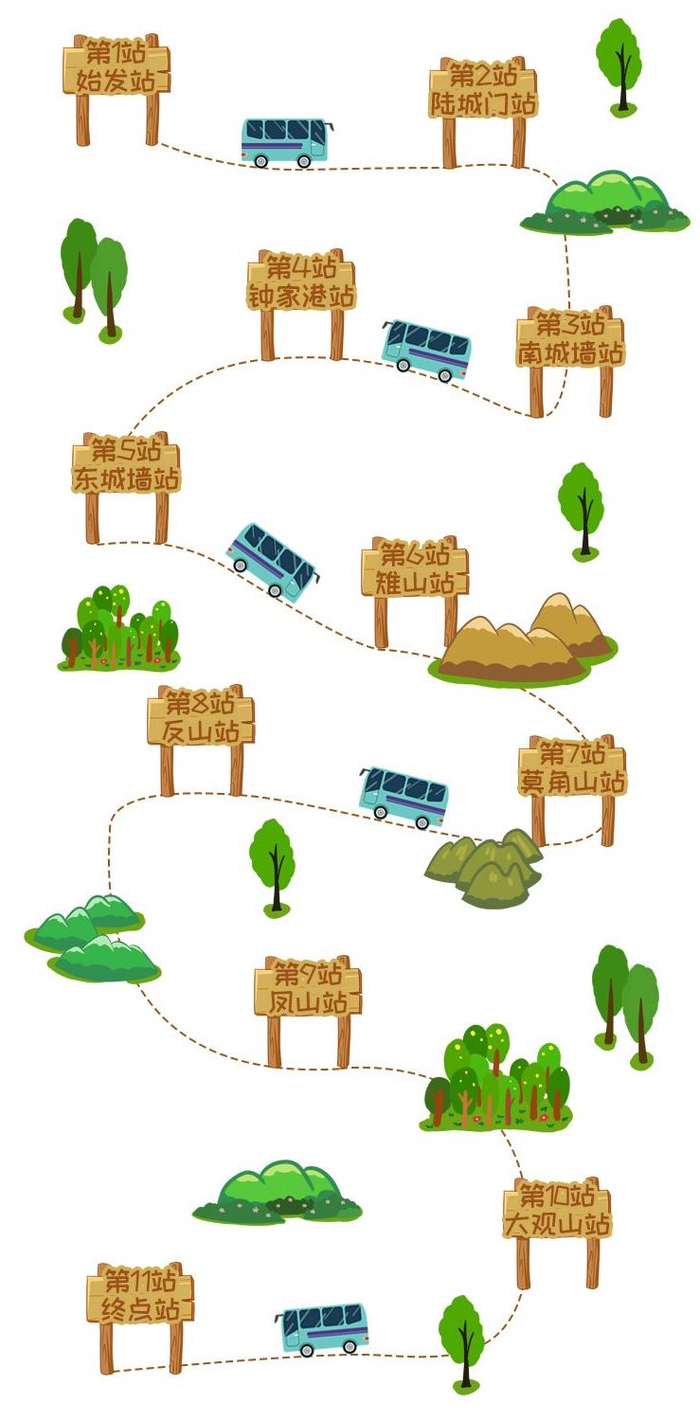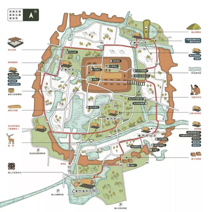 为了便于游客更好地参访面积达631公顷的城址区,良渚古城遗址公园官方为游客设计了一条11个游览车停靠站点的游览线路。入园访客可根据站点停靠位置,下车参观游览。