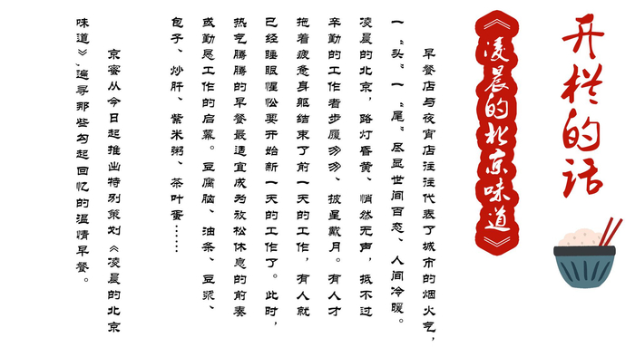 早餐店与夜宵店往往代表了城市的烟火气,一“头”一“尾”尽显世间百态、人间冷暖。凌晨的北京,路灯昏黄、悄然无声,抵不过辛勤的工作者步履匆匆、披星戴月。有人才拖着疲惫身躯结束了前一天的工作,有人就已经睡眼惺忪要开始新一天的工作了。此时,热气腾腾的早餐最适宜成为放松休息的前奏或勤恳工作的启幕。豆腐脑、油条、豆浆、包子、炒肝、紫米粥、茶叶蛋……京蜜特别企划《凌晨的北京味道》,遍寻那些勾起回忆的温情早餐。