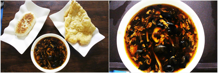 看着这个菜单,京蜜大手一挥,豆腐脑、油饼和大火烧统统安排上。不一会儿,热气腾腾的豆腐脑就端上来了,豆腐脑里面的卤有很多材料,包括杏鲍菇、香菇、黄花菜、木耳、牛肉末、鸡蛋,吃上一口,唇齿留香,真的是美滋滋的。