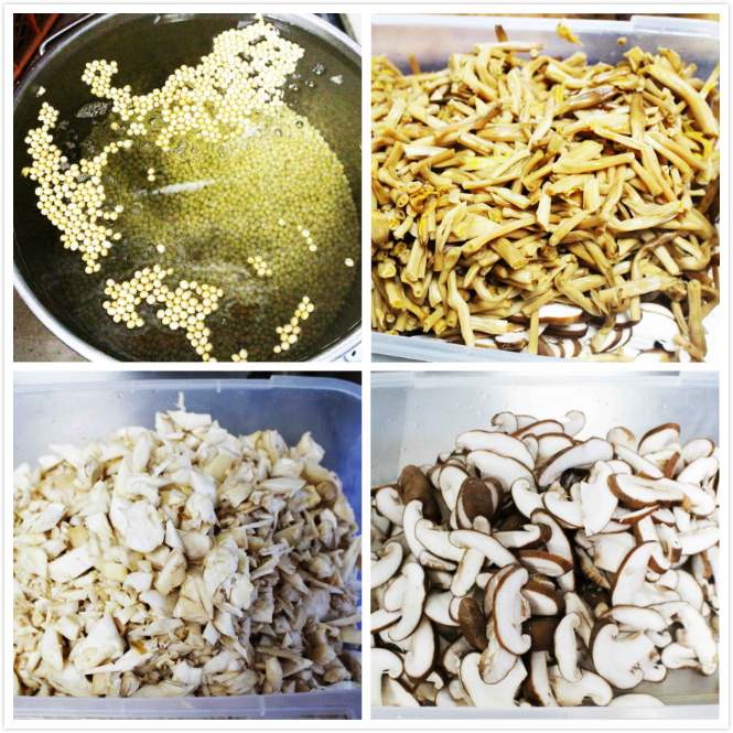 接着就是泡黄豆,黄花菜切断、杏鲍菇切块、香菇切片……以上种种都是为了第二天制作豆腐脑做的准备工作而已。