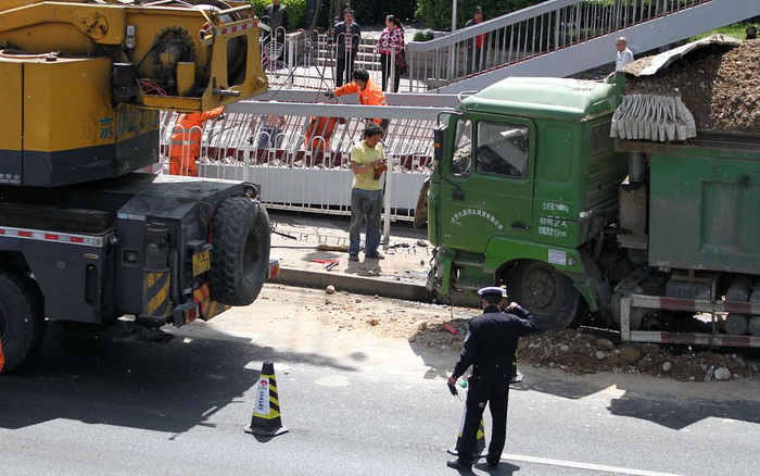 同年8月27日,北京北五环北苑桥由东向西方向,一辆拉饮料的大货车车厢部分发生侧翻。司机解释自己是为防止与前车追尾,连忙打方向盘,结果部分车厢发生侧翻。