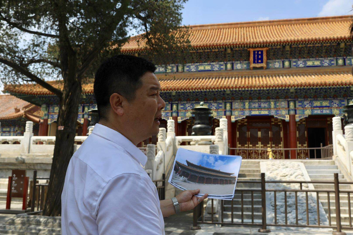 景山公园副园长宋愷手持修缮前的寿皇殿照片介绍修缮情况。摄影/新京报记者 浦峰