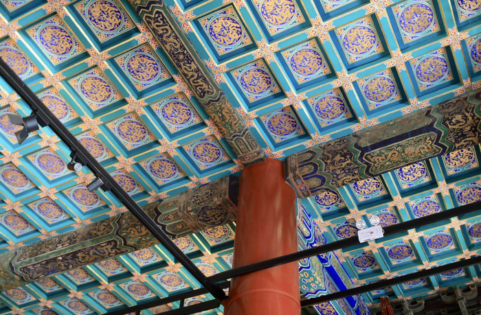 寿皇殿顶部保留了一些梁上保存尚好的旧彩画,天花则重绘了新彩画,游客可以感受修缮的痕迹。摄影/新京报记者 浦峰