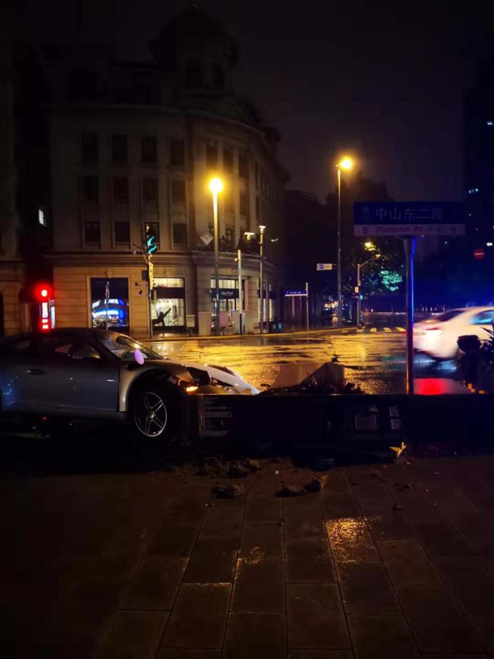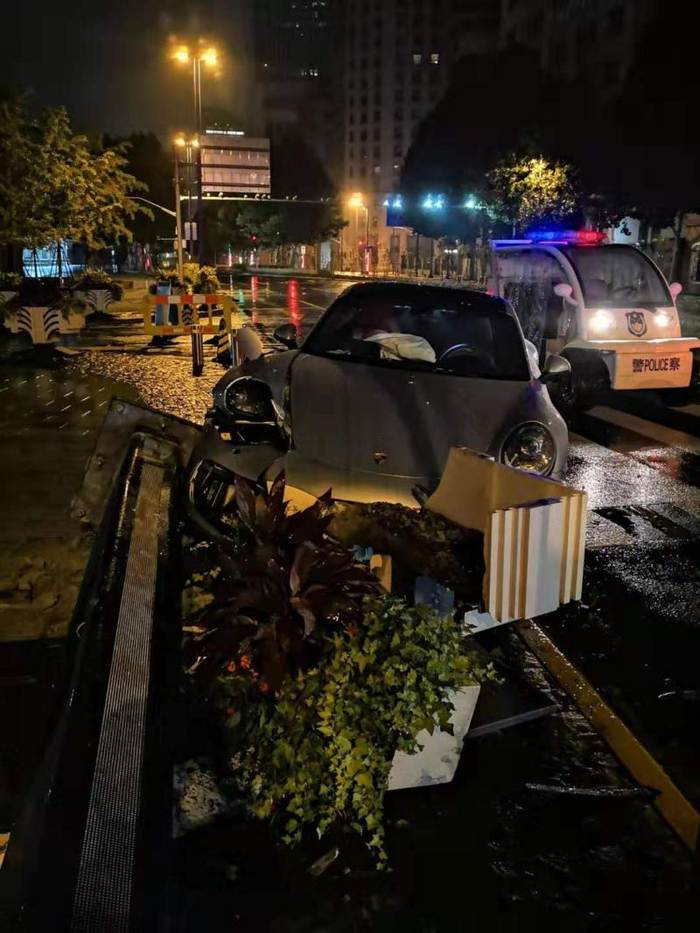 肇事保时捷撞停在路口花坛及人行信号灯柱处