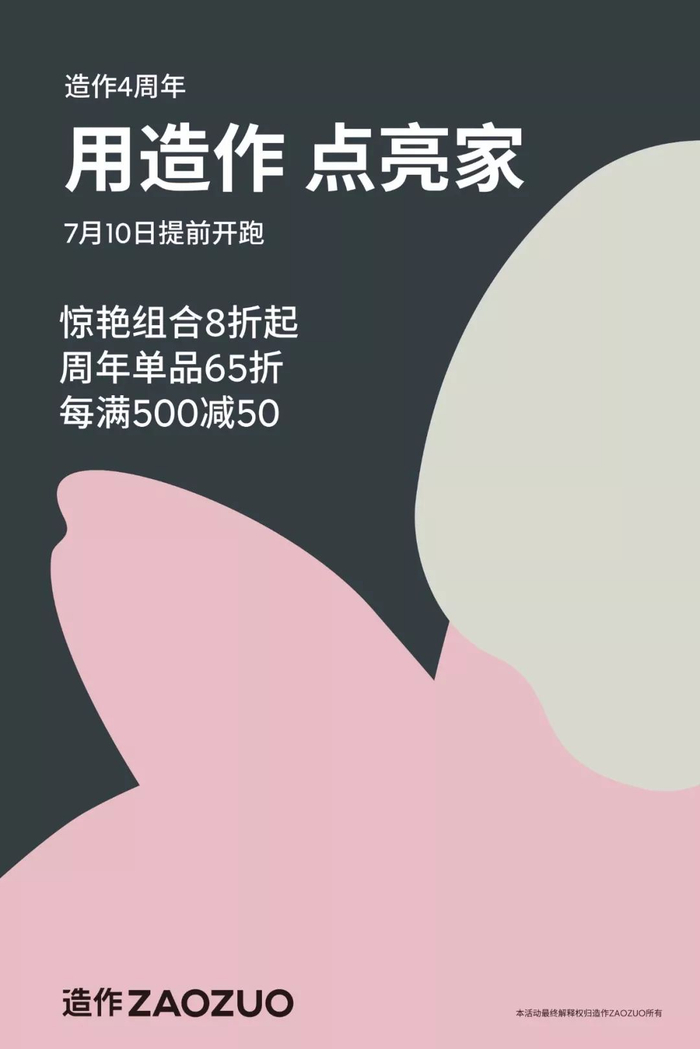 本月设计家居品牌造作将迎来四周年庆典,一系列周年福利正式启动。来自27国过百位的全球签约设计大师齐聚一堂为你出谋划策,用小预算、短时间轻松点亮全屋。活动期间将推出超过30组的惊艳组合低至8折;7月16日至7月22日,造作每天精选4款世界设计单品6.5折;每满500元减50元活动,上不封顶,还可与其他优惠同时叠加。