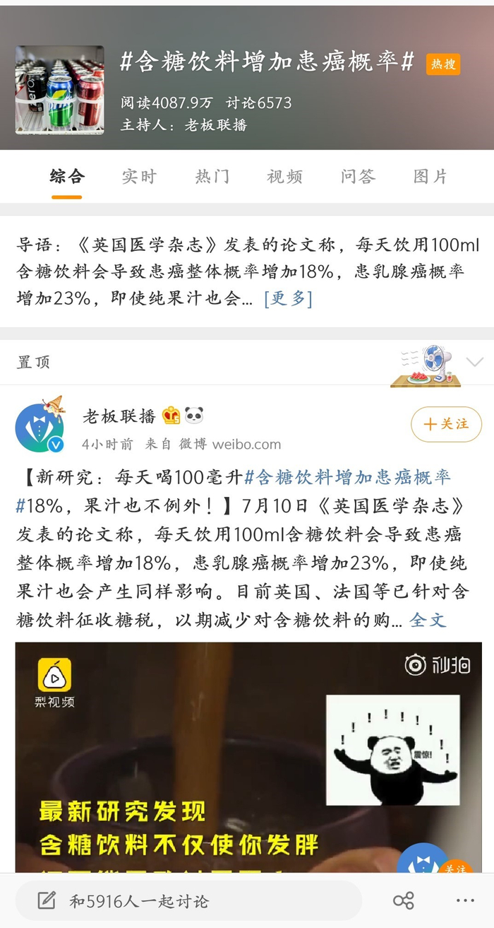 新京报讯(记者 冯毅)7月10日,《英国医学杂志》发表的论文称,每天饮用100ml含糖饮料会导致患癌整体概率增加18%,患乳腺癌概率增加23%,即使纯果汁,也会产生同样影响。研究结果引起了人们的广泛关注,还一度成为了微博的热搜新闻。