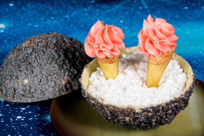 此外,每款小吃和甜品也融入了星空元素,十分有趣。比如,流星荔枝慕斯是一款由应季荔枝制作的甜品,巧克力外壳里,包裹着晶莹剔透的蓝色跳跳糖,里面的球形荔枝果冻蛋糕像一颗星球一样小巧可爱。而R3-D3银河榛子丝绒蛋糕,还原了星球大战中机智勇敢并且憨厚可爱的R2-D2机器人。