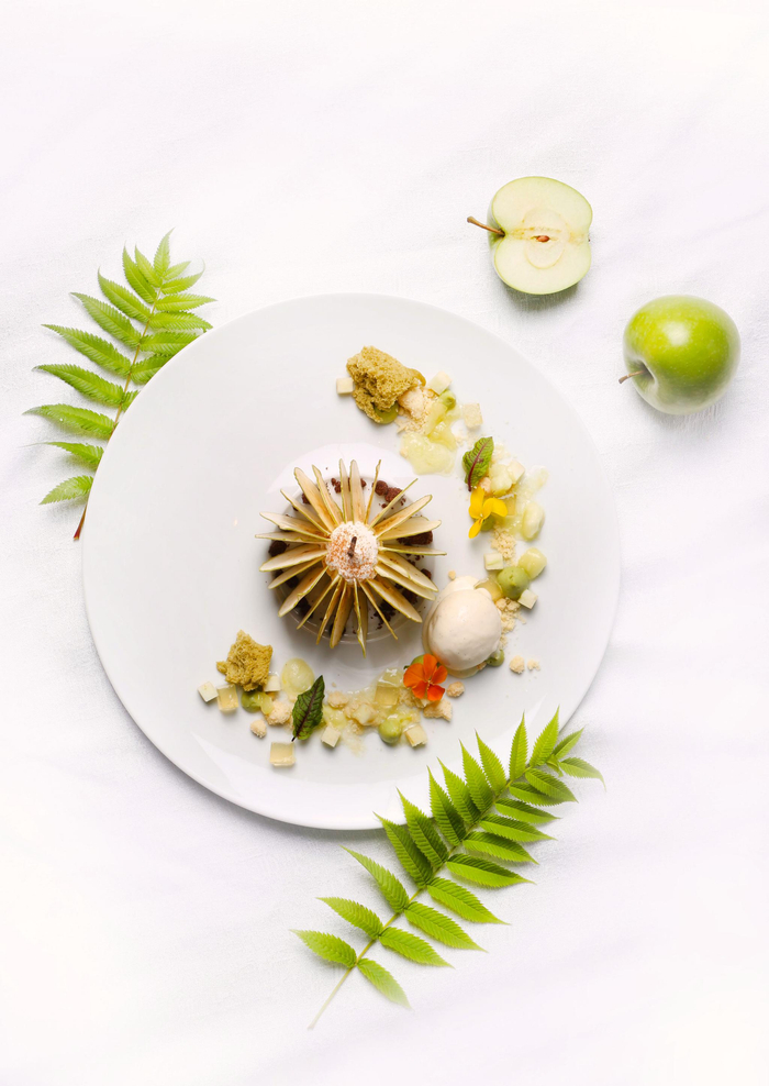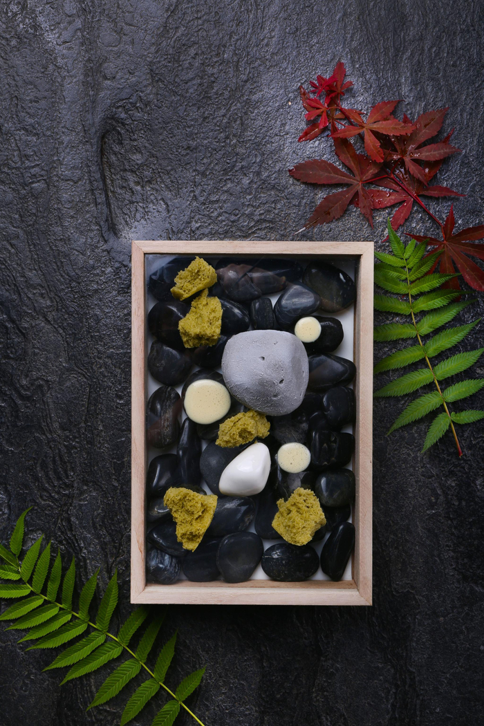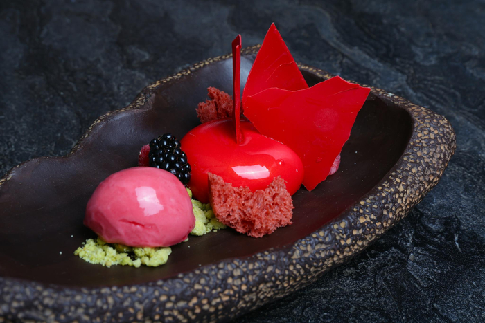 最酷的是“峦”,融合了黑芝麻慕斯、醪糟、口感细腻的茉莉花慕斯、绿茶空气海绵蛋糕与香草酱……从山峦起伏的造型到茶叶食材,淋漓尽致地诠释着中国庭院之美。而最受女生喜爱的甜点大概是“绯”,色彩明艳,草莓与罗勒熬制的内馅充满层次感,几乎每个细节都令味蕾惊艳。自制的开心果酥、覆盆子冰霜以及玫红色空气海绵蛋糕,更能点亮明媚午后。