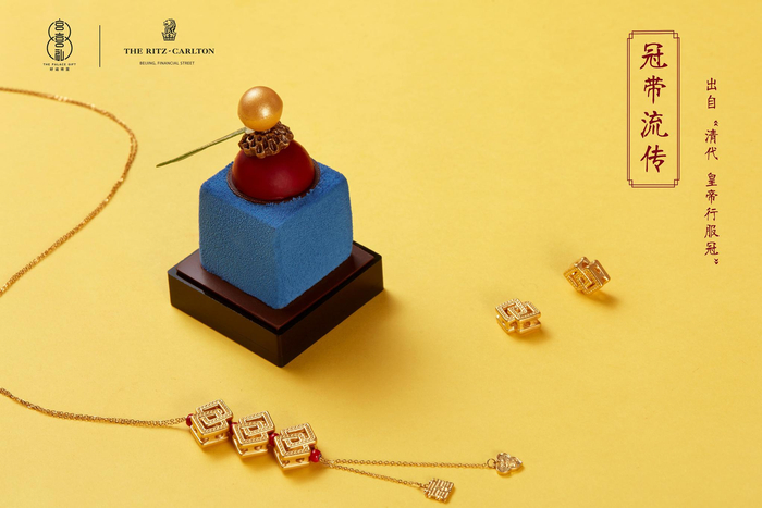 酒店甜品师团队以此为设计灵感,创作出故宫元素的下午茶点——四款定制下午茶点,分别主打朝服、盘扣、蝴蝶、花鸟等中国明清皇家文化中的经典元素。比如,“冠带流传”是一款蓝色的香蕉慕斯配榛子巧克力夹心,灵感源于清代朝服和官帽,还原“清代皇帝行服冠”。