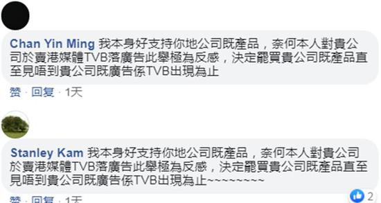 有香港极端网友在喜宝香港脸书评论区留言,要求喜宝撤下在TVB投放的广告