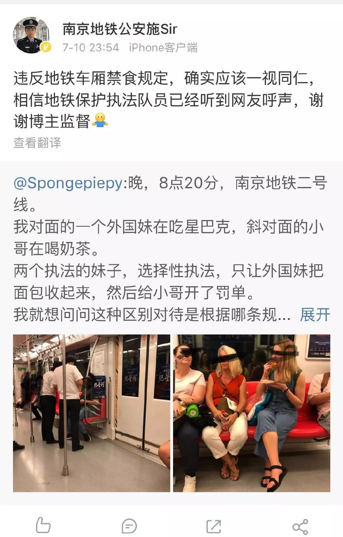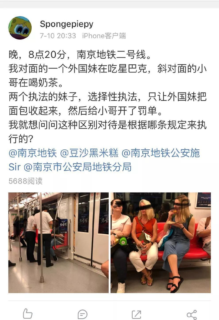 事情发生在7月10日晚上的南京地铁二号线上。该网友的微博内容称:“晚,8点20分,南京地铁二号线。我对面的一个外国妹在吃星巴克,斜对面的小哥在喝奶茶。两个执法的妹子,选择性执法,只让外国妹把面包收起来,然后给小哥开了罚单。我就想问问这种区别对待是根据哪条规定来执行的?”