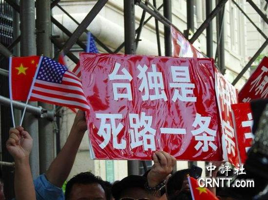 纽约时间12日下午2时30分,蔡英文抵达哥伦比亚大学国际事务中心,有近50位华侨在对街马路高喊“蔡英文滚出纽约”、“打倒‘台独’”等口号抗议