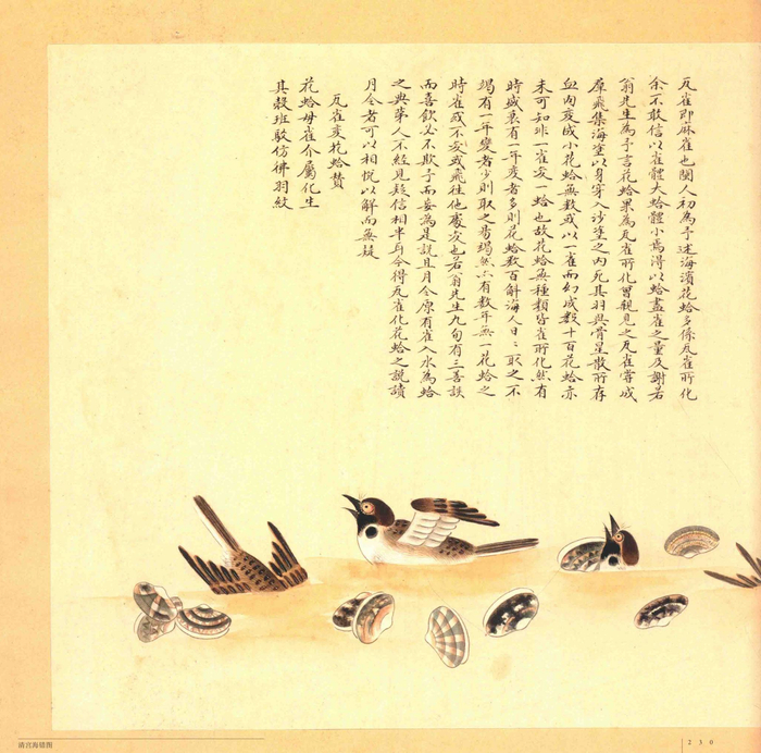这句怒骂的背后,是聂璜对化生说的一个看法:物质不灭。聂璜认为化生也要讲道理,如果一个大动物变成了小动物,那大动物多余的那部分肉难道就凭空消失了吗?这不合理。所以两种动物如果要互相转化,必须体型相仿。聂璜的这种理论,在《海错图》的“瓦雀化花蛤”一图里也有体现。聂璜一直听福建人说,海滨的花蛤多为瓦雀(麻雀)所化,但他不敢信。因为“雀体大,蛤体小,焉得以蛤尽雀之量?”后来,有位叫谢若翁的老先生对他说:“是真的,我亲眼见过。麻雀群飞到滩涂,一头扎在泥里死去,羽毛和骨肉散开,变成无数小花蛤,一只雀能化成数十百花蛤,并非一雀变一蛤!有一年变得多,花蛤天天挖都挖不完。有一年变得少,很快就挖完了。有时好几年都挖不到一枚,可能是麻雀不想变,或者飞到别处变去了。”