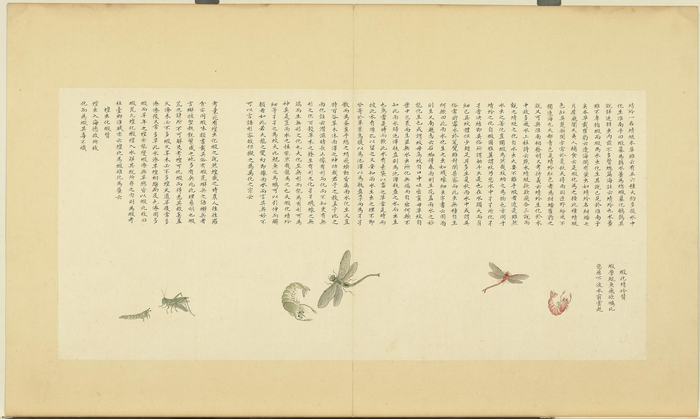 类似的案例还有《海错图》中的“虾化蜻蛉”。聂璜画了一只青色虾,旁边有个青色的蜻蜓。又画了个红色虾,旁边有个红蜻蜓。意思是不同颜色的蜻蜓,是由相应颜色的虾变成的。其实虾和蜻蜓的搭配实在不该出现,因为蜻蜓的稚虫叫“水虿”,生活在淡水里,成熟后就爬上岸脱壳变为成虫,这实在是稍微留意就能观察到的自然现象,古人难道连这点观察力都没有?聂璜援引汉朝的《淮南子》:“水虿为蟌”,蟌是蜻蜓的另一个名字,说明汉朝人就知道了蜻蜓的生活史。而聂璜却认为“水虿虽不专指虾,而虾为水虫化生,其说已见于淮南子矣”,把水虿和虾混淆起来了。
