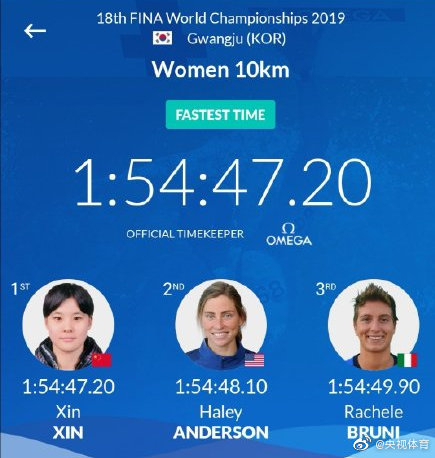 中国选手辛鑫以1小时54分47秒2的成绩夺冠,这是中国队历史上的第一枚世锦赛公开水域游泳金牌。
