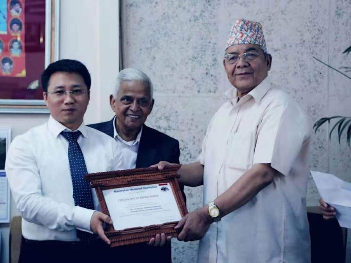 尼泊尔副总理代表尼泊尔为地震捐款华人颁发捐赠证书