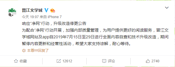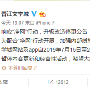 晋江文学城:7月15日至29日进行内容自查 暂停更新 新京报 新京报官方账号 2019.07.1520:14 关注 原标题:晋江文学城:7月15日至29日进行内容自查 暂停更新 新京报快讯 据晋江文学城官方微博消息,7月15日,晋江文学城发布升级改造停更公告。全文如下:为配合“净网”行动开展,加强内部质量管理,为用户提供更好的阅读服务,晋江文学城网站及app自2019年7月15日至29日进行全面内容自查和技术升级改造,期间暂停内容更新和经营性活动,希望大家支持谅解,耐心等待。 图片来源:微博截图