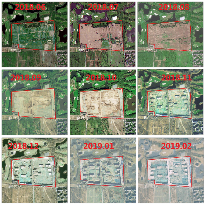 一个典型的建筑施工地块动态变化遥感监测图。图源:北京市环境保护监测中心遥感室