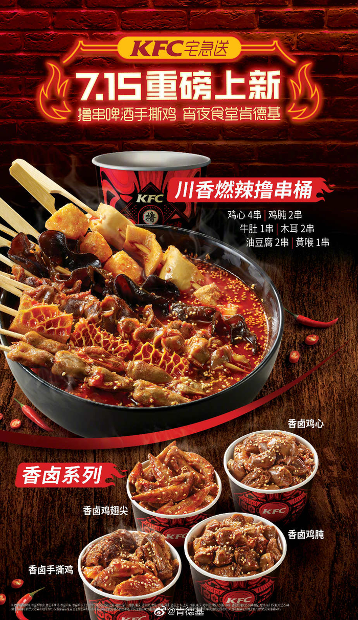 7月15日起,肯德基开始售卖夜宵,“撸串啤酒手撕鸡,宵夜食堂肯德基。”根据宣传海报得知,夜宵包含两类产品,一是“川香燃拉撸串桶”,标配含有鸡心、鸡肫、牛肚、木耳、油豆腐、黄喉6种产品,一共12串;另一种是“香卤系列”,有香卤鸡翅尖、香卤鸡心、香卤鸡肫、香卤手撕鸡,每种产品独立一桶。