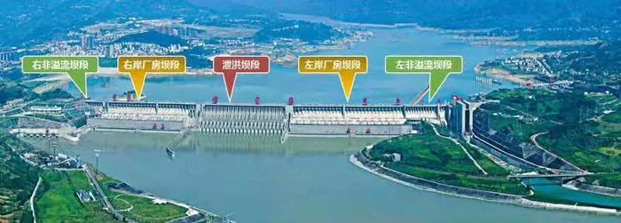 三峡大坝为混凝土重力坝,坝顶高程185m,最大坝高181m,坝底宽度126m,坝轴线全长2309.50m,共分为113个坝段。大坝自左向右分为:左岸非溢流坝段、升船机坝段、临时船闸坝段、左岸厂房坝段、左导墙坝段、泄洪坝段、纵向围堰坝段、右岸厂房排沙孔坝段、右岸厂房坝段、右岸非溢流坝段。坝段间采用横缝分隔,各坝段可单独受力。泄洪坝段横缝间距21.00m;厂房坝段钢管坝段横缝间距25.00m、实体坝段横缝间距13.30m;两岸非溢流坝段横缝间距一般为20.00m。横缝上游侧设有两道止水铜片。