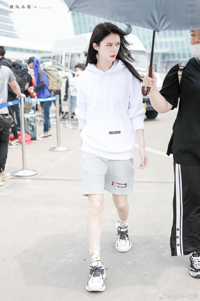 火箭少女101组合的傅菁在机场街拍中穿上了ASH白色FLASH系列老爹鞋。图片来源:ASH品牌官方微博截图
