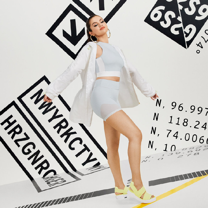 赛琳娜•戈麦斯脚踩柠黄色的PUMA SG x Cali凉鞋,活力十足。图片来源:PUMA官方微博截图