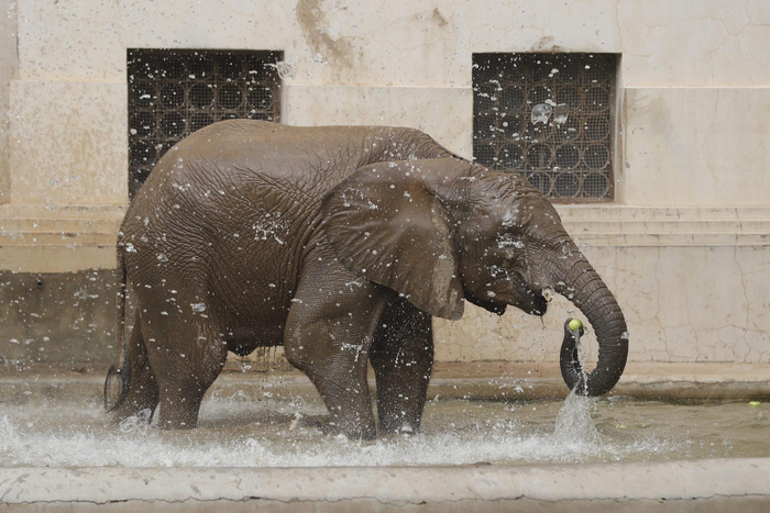 大象馆今年在原有水池的基础上,又添加了喷淋及泥池等设施,实现了“泥浴”、“沙浴”、“水浴”的联合。大象运动场还加装了“黑科技”——自动补水系统,让室内水箱与室外饮水池相连:当室外水池水量减少时,室内水箱会自动补水“无限续杯”。何绍纯介绍,大象虽是非洲动物,但也很怕热,特别是怕太阳直晒。因此,在泥塘里打滚是大象的最爱,将泥巴裹满全身可以堵住皮肤的褶皱,避免被蚊虫叮咬,也可以起到防晒作用。而“沙浴”的沙堆质地松软,踩在上面会有起伏感,可以让大象感受多种刺激体验,同时也能起到“皮肤护理”的效果。
