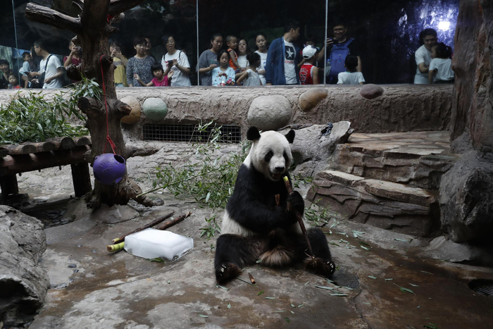 今天上午,记者在大熊猫馆室内馆看到,大熊猫“古古”正坐在一块冰块旁享用“竹笋大餐”,憨态可掬的模样引得游客们纷纷围观拍照。