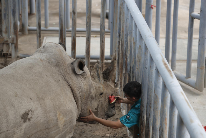 饲养员将西瓜喂给犀牛。摄影/新京报记者 侯少卿
