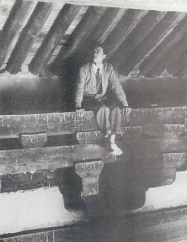 梁思成在测绘善化寺普贤阁斗拱后尾时留影。