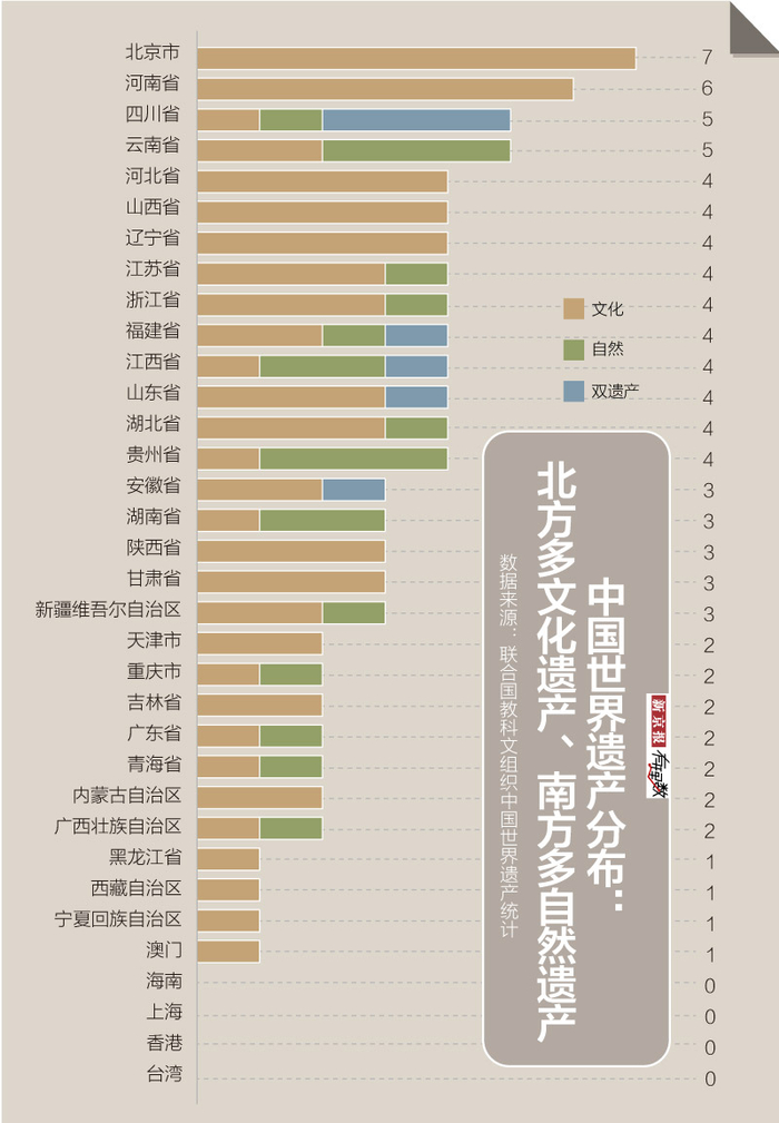 在我国,世界遗产很明显地呈现了“北方地区以文化遗产为主,南方地区以自然遗产为主”的特点。