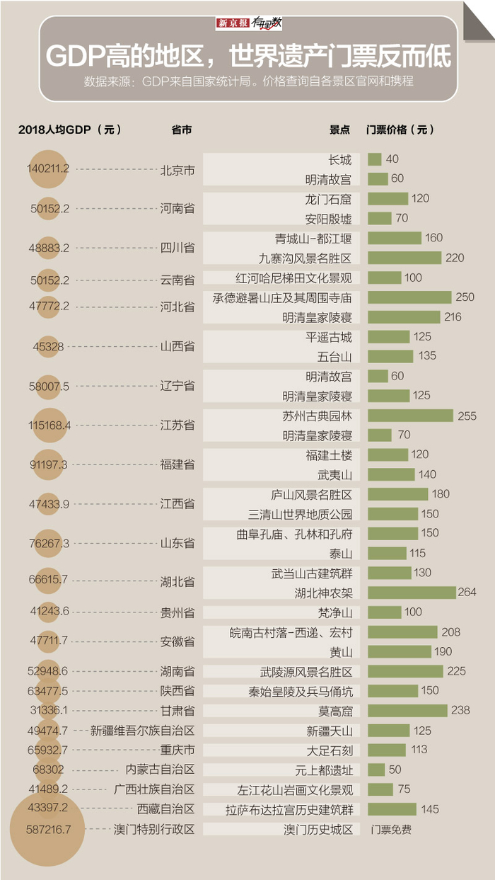 在人均GDP达14万多的北京,长城、故宫的收费多在百元以下。在人均GDP近59万的澳门,历史城区完全免费。虽然经济较发达的江苏省也出现了价格250元以上的苏州古典园林,但这其实是套票,其中包括的拙政园、狮子林、留园等单个价格均不过百。