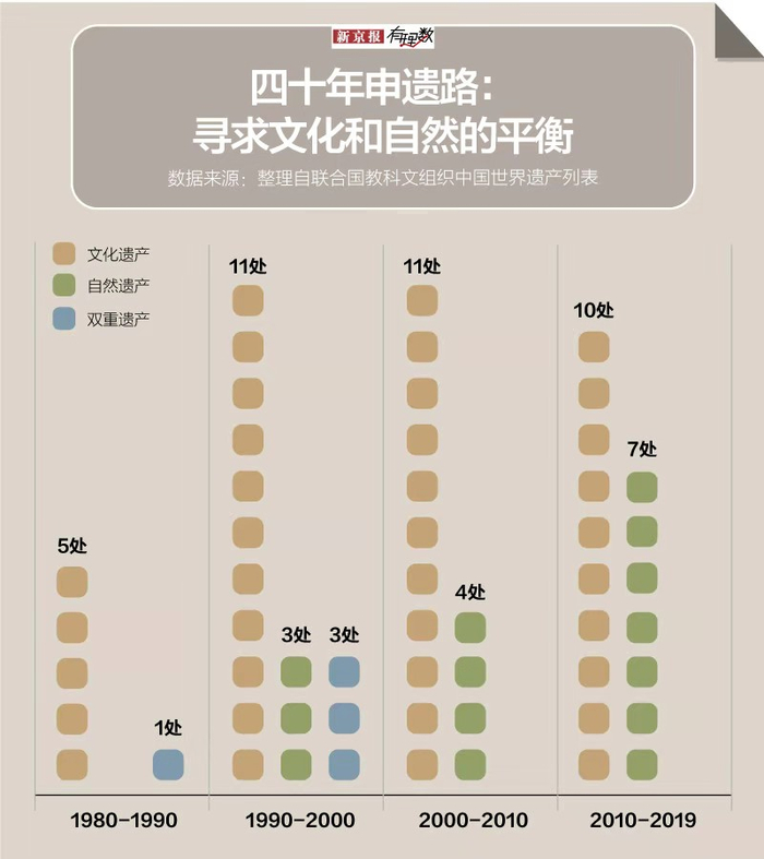 自我国1985年成为《保护世界文化和自然遗产公约》缔约国一员开始,我国四十年的申遗路上,无论哪个十年,都是文化遗产数量被列入名录最多。文化遗产和自然遗产发展显著不均。