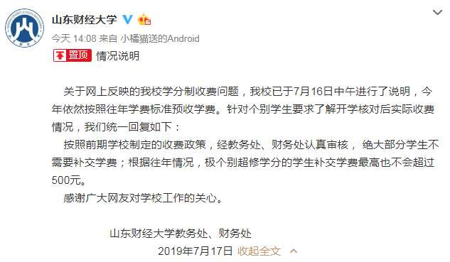 7月17日,山东财经大学官微发布通知称,今年将仍按往年学费标准预收学费,经过教务处、财务处审核,和前期学校制定的收费政策,绝大部分学生不需要补交学费;根据往年情况,极个别超修学分的学生补交学费最高不会超500元。