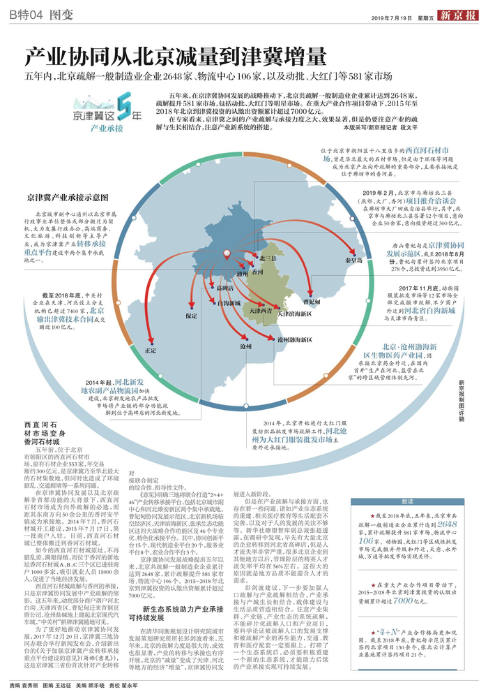五年来,在京津冀协同发展的战略推动下,北京共疏解一般制造业企业累计达到2648家,疏解提升581家市场,包括动批、大红门等明星市场。在重大产业合作项目带动下,2015年至2018年北京到津冀投资的认缴出资额累计超过7000亿元。
